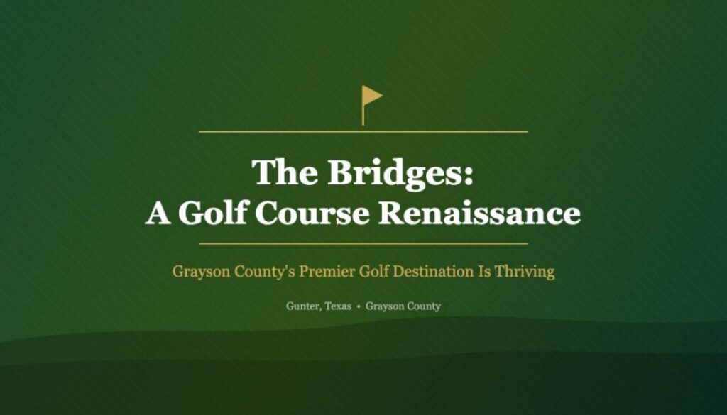 Drive north from the sprawl of McKinney and Frisco, past the last strip of new-build retail, and the prairie opens up. Somewhere along the two-lane stretch into Gunter, the horizon line dips, a row of mature oaks frames a fairway, and you realize you’ve arrived at one of the most quietly impressive golf destinations in North Texas. The Bridges Golf Club — an 18-hole Fred Couples signature course tucked into the rolling terrain of Grayson County — is in the middle of a full-blown renaissance, and the word is getting out.